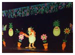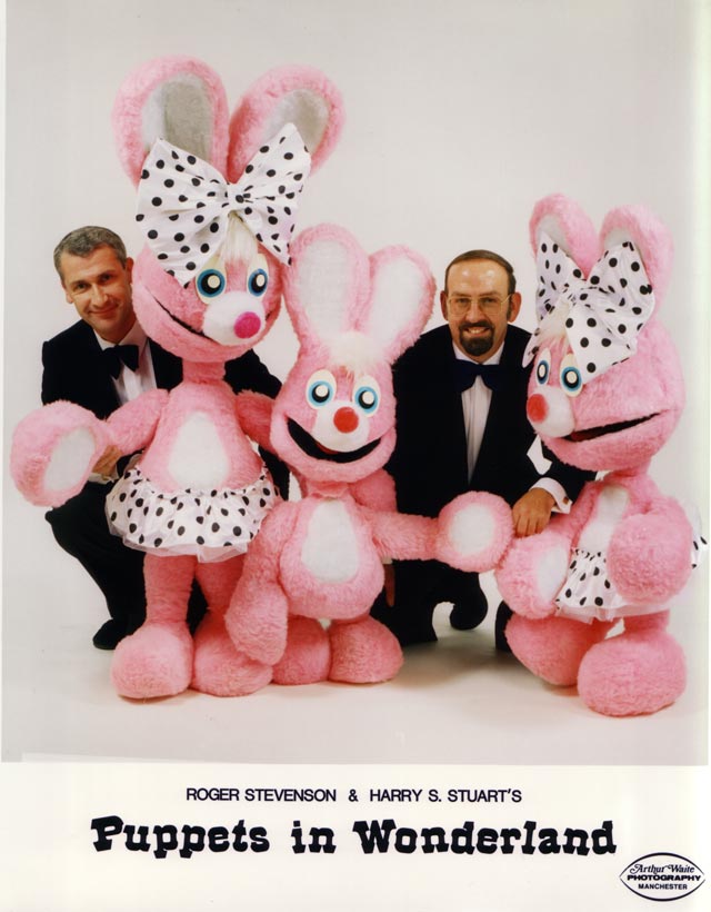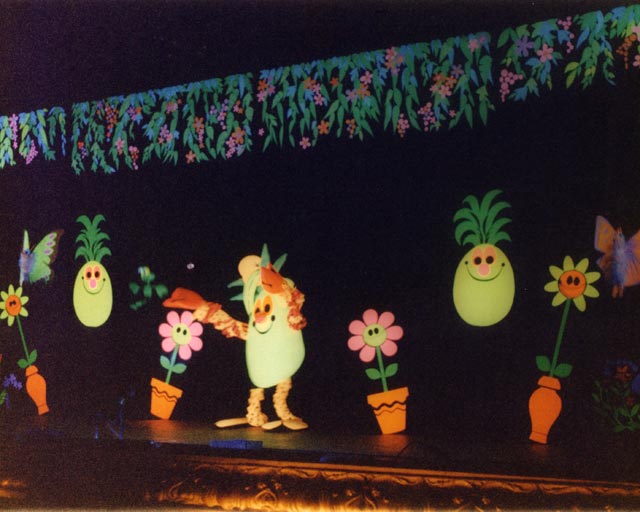 This was the name given to the 'UV' Black Light act that was specifically designed for Pantomimes. Most of the Puppets were carved from foam rubber with fluorescent fur or fabric covering and were very large. The sequence was designed to be operated by one lead Puppeteer but then the 'Pantomime Babes' also assisted with simpler puppets. The act was presented in a 'UV" border. Click to enlarge: |