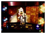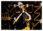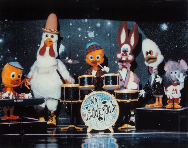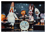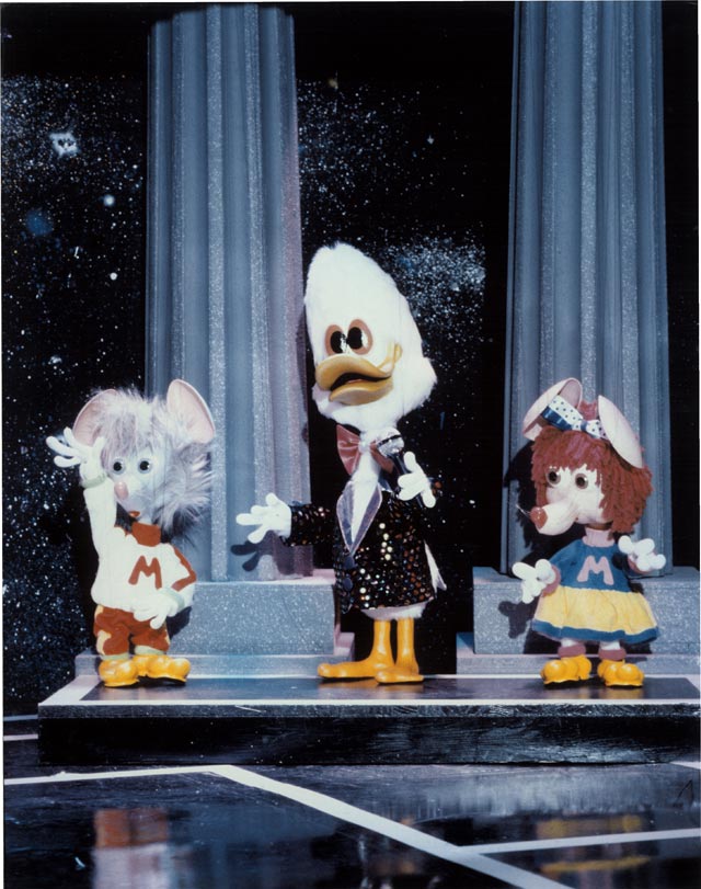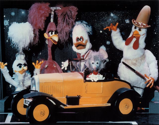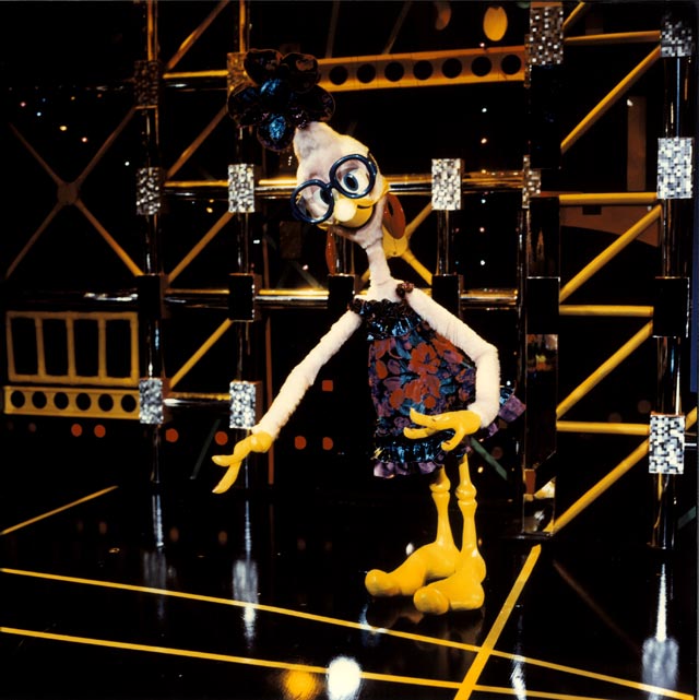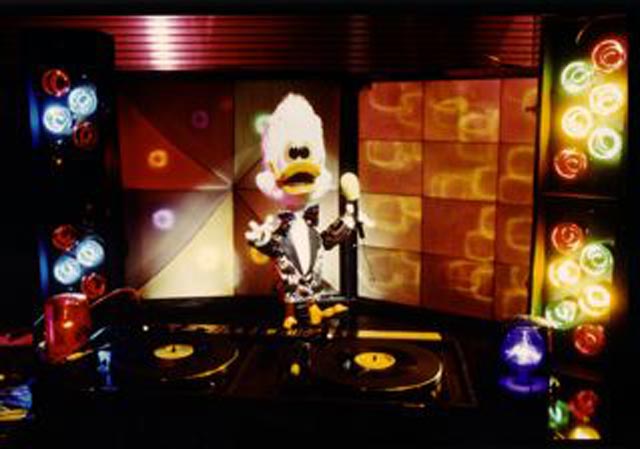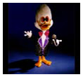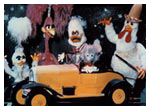 Dooby was originally designed in 1981 but made his debut in the main stage act in the 1985/ 6 Christmas Pantomime 'Babes in the Wood' starring Les Dawson at the Palace Theatre Manchester. He appeared in 'The Ghostbusters' sequence and literally stopped the show. He then appeared in the same sequence for the 1987 Children's Variety Performance from The London Palladium and was given his first series for BBC Television. This was called 'Dooby Duck's Disco Bus' and ran for thirteen five-minute episodes. It was transmitted at 3.55 in the afternoon and brought in an audience of some three million viewers. It had somewhat of a cult following amongst students. Prior to the transmission of the series, excerpts were shown in a programme called 'The Satellite Show'. Series Two was called 'Dooby's Duck Truck' and featured Dooby and the gang touring the disco in a huge articulated Truck. Again there were thirteen episodes. Series Three was called 'Dooby's Euro Tour' and featured episodes in Spain, France etc. Harry was the voice of Dooby, which was processed to a higher pitch. Click to enlarge: |